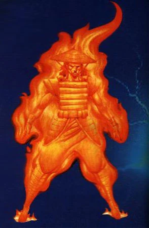 Se dice que hace varios años, durante el primer intento de escape del Netherrealm de Shinnok, cuando Quan Chi encargó al original Sub-Zero recuperar el Medallón de los Elementos, y éste venció a los 4 Dioses (Agua, Roca, Viento y Fuego), éstos fueron castigados. Pero el Dios del Fuego se reveló contra los Elder Gods, y les gritó que había sido injusto, que la culpa de todo la tenían ellos y Raiden, por no haber intervenido. Los Elder Gods enfurecieron, y enviaron el espíritu del Dios del Fuego a una espada, en donde residiría su gran poder, como su prisión hasta tiempo indefinido.