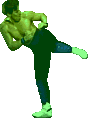 Golpe de Sombra Verde: Levanta la pierna, ejecuta una especie de traslación dejando un rastro de sombras verdes y se detiene con una patada en el torso.