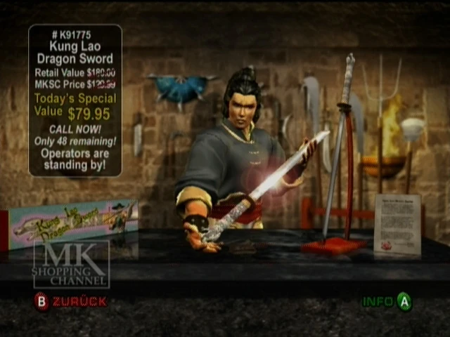"How much would you pay to take off an opponent’s limb in one slice? $129.99? $189.999? Well, today MK Shopping Channel is offering the official Kung Lao Dragon Sword for only $79.95! Endorsed by the master teacher himself, the Dragon Sword will come with a letter of authenticity sealed with blood. Don’t let this great offer pass you by. CALL NOW!"