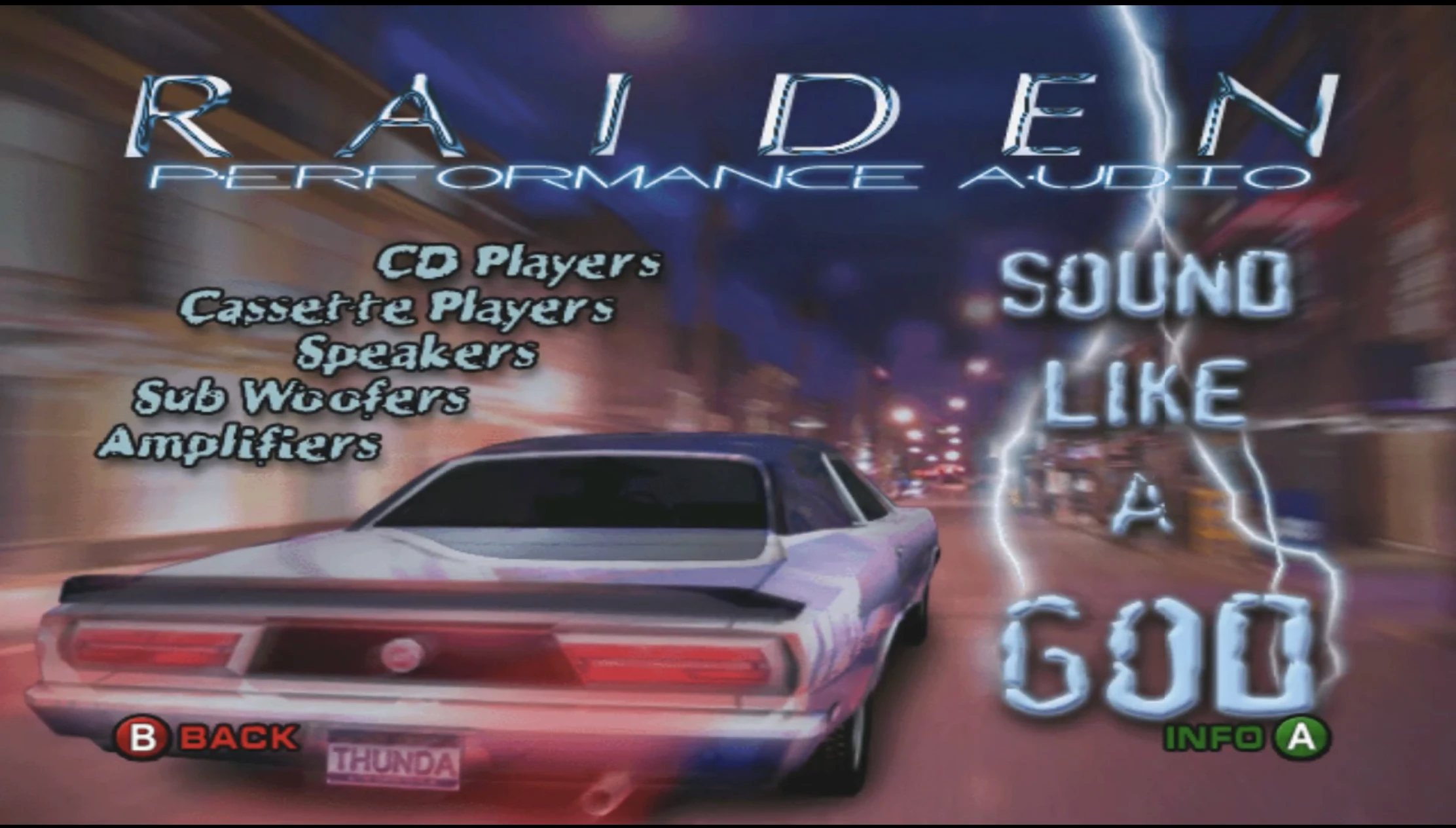 Raiden Performance Audio is a fictional high quality audio system fit for your car, presented by the God of Thunder Raiden. It can obtained and found in the Krypt and Extras kontent gallery of Mortal Kombat: Deadly Alliance.